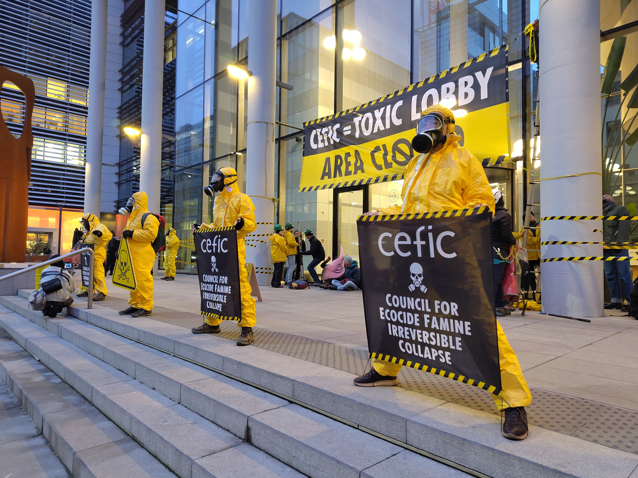 À 7h30 ce matin, les activistes, dont certain·es portaient des masques à gaz et des combinaisons, ont bloqué les entrées du siège de Cefic, situé rue Belliard 40, à l'aide de ruban de signalisation jaune et noir et de grandes banderoles annonçant le bâtiment « fermé ». Ils ont également rebaptisé l’immeuble « Conseil pour l'écocide, la famine et l'effondrement irréversible ». Cette action dénonce l'influence toxique de Cefic sur les politiques européennes, notamment son lobbying visant à affaiblir de nombreuses législations protectrices du climat et de la nature (2). [Un porte-parole communiquera ultérieurement sur la fin de l'action.]